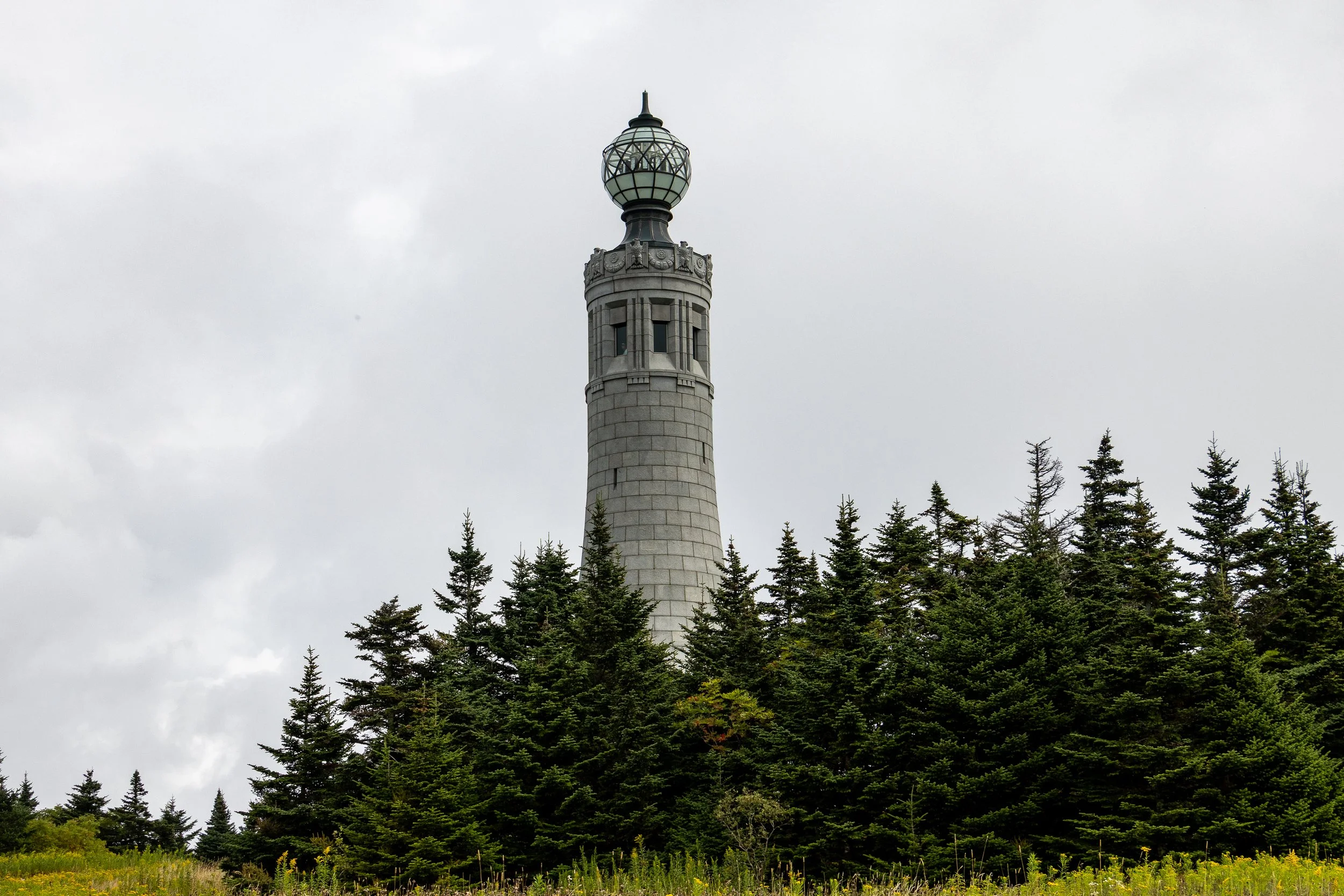 Instead of a surveyors badge or sign marking the highest point, Massachusetts went several steps further, and higher, and erected a monumental tower that rises above the landscape and boldly marks the highest point. The Veterans War Memorial Tower stands 93 feet over the summit, and offers excellent views of the surrounding mountains and valleys. At the top of the tower there is a translucent globe that shines brightly at night, except for a few weeks during the height of the migration season for seasonal birds.